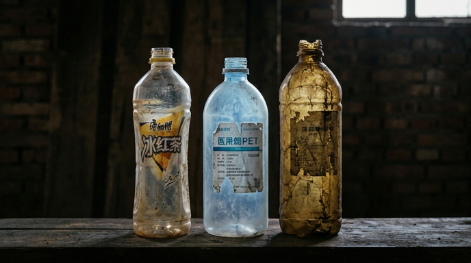 经长期日晒、高温氧化的废旧瓶,分子链断裂,瓶体发黄发脆。混入后会拉高瓶片黄度、降低力学性能,无法用于高端吹瓶、长丝场景,还会造成批次品质剧烈波动,品控完全失控。